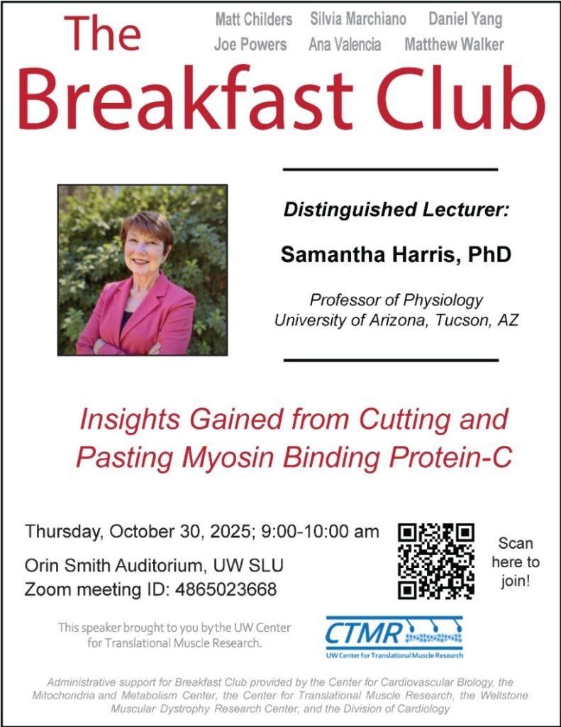 Breakfast Club is a SLU seminar event hosted weekly by UW faculty members from various fields and departments including cardiology, pathology, metabolism, molecular and cellar biology, and other biomedical and genome science related disciplines. Each week an esteemed speaker, either local or invited Distinguished Lecturers from out of town, will come to give a 50-minute presentation plus 10-minutes for questions on topics in cardiovascular biology ranging from research to general health issues to scientific methodology.