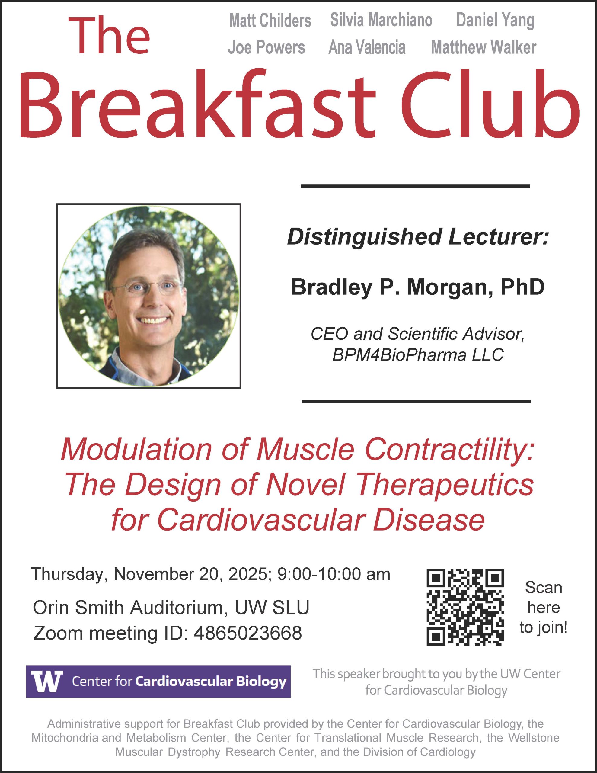 Breakfast Club is a SLU seminar event hosted weekly by UW faculty members from various fields and departments including cardiology, pathology, metabolism, molecular and cellar biology, and other biomedical and genome science related disciplines. Each week an esteemed speaker, either local or invited Distinguished Lecturers from out of town, will come to give a 50-minute presentation plus 10-minutes for questions on topics in cardiovascular biology ranging from research to general health issues to scientific methodology.